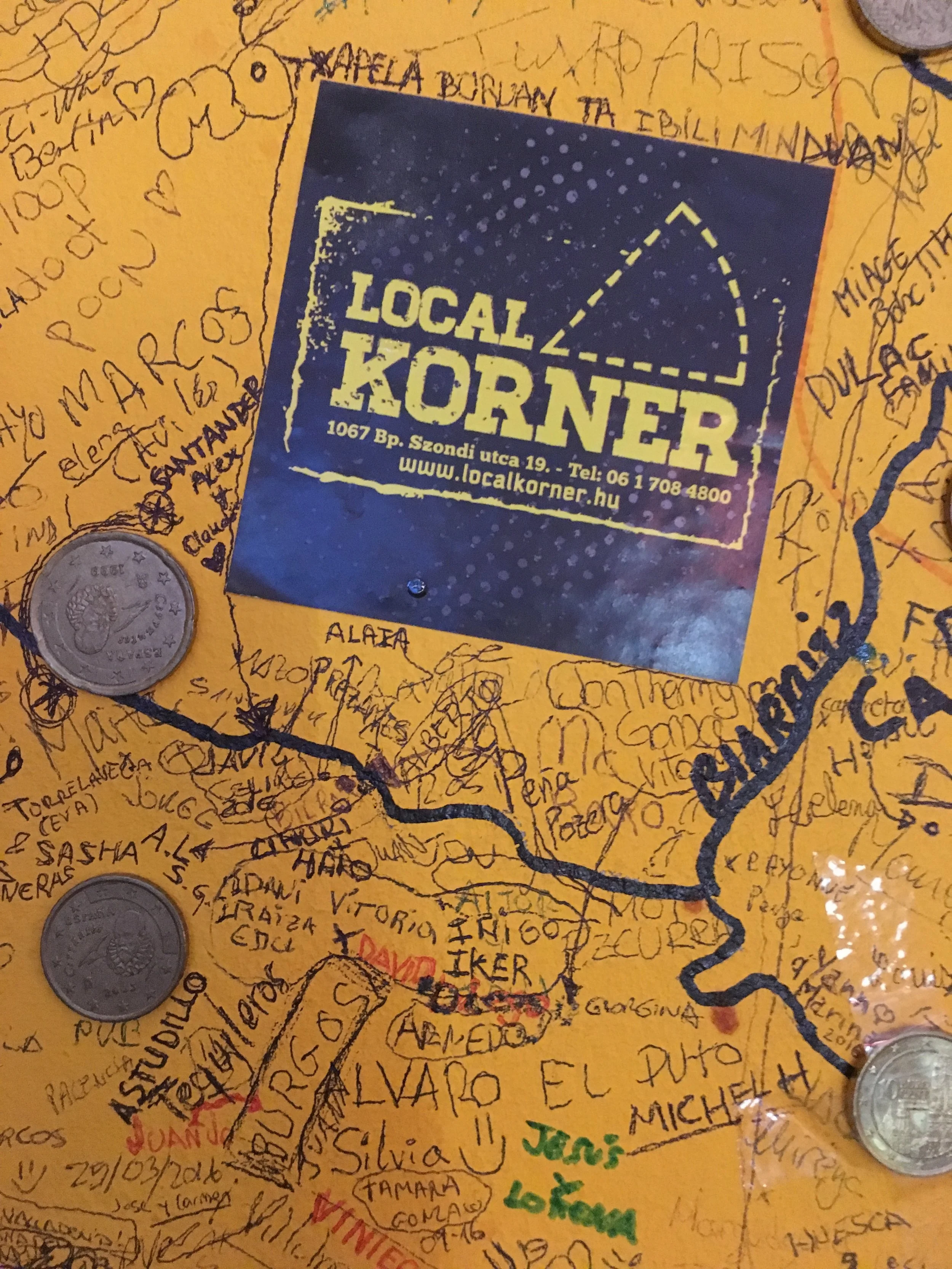 In terms of ambiance, one of my favorite restaurants in Budapest was actually a hole-in-the-wall pizza place called “Local Korner.” There is only room for about six people to sit inside. The walls are covered with a map of the world, and everyone who comes in can write something on the spot where they are from. A lot of people tape money on the wall too. There are currencies, names and well wishes from all over the world encircling you – it’s fantastic. Many countries on the wall were getting full, so I did write something on the wall but in a secondary location. Hats off if you can find it! The guys who own the place are awesome – they are all about keeping it local but are looking for a slightly bigger spot. They said they are trying to figure out if they can pull down pieces of the existing wall to take with them – I hope so!