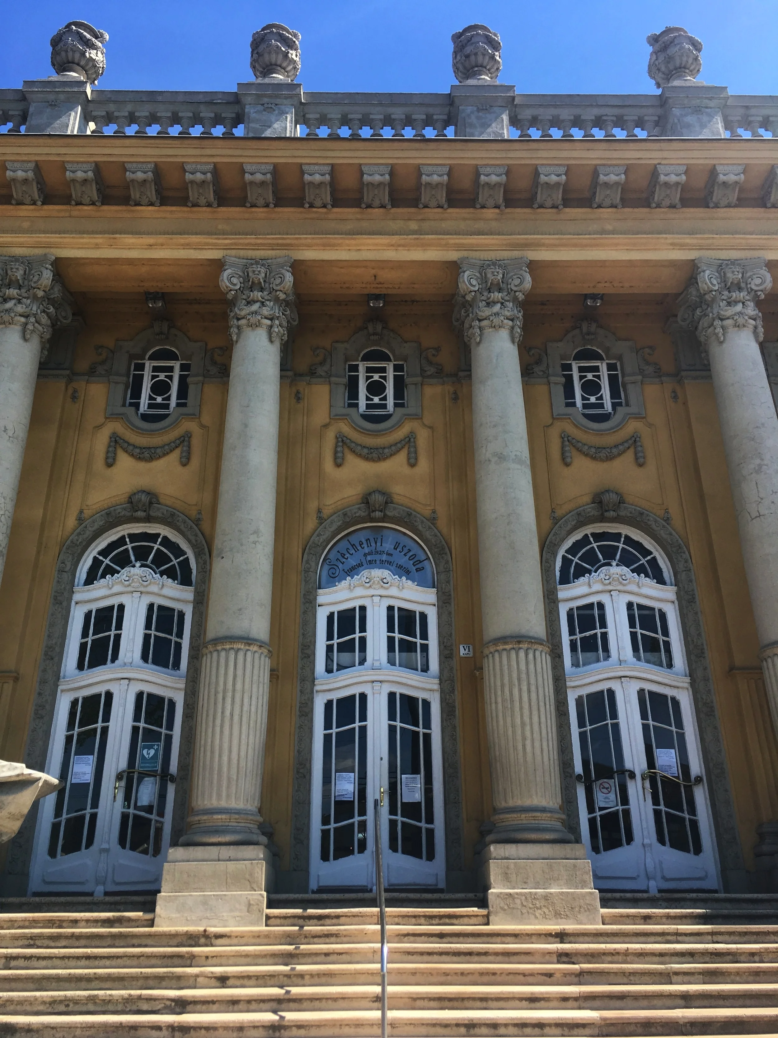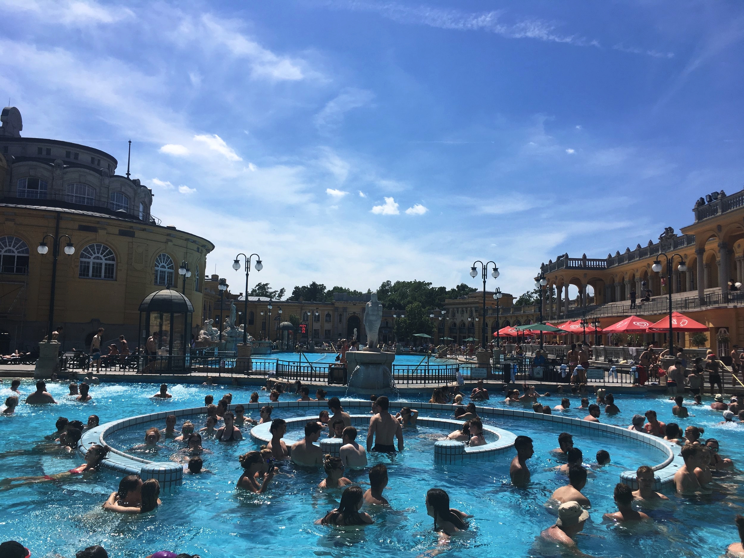 When in Budapest, you also have to go to a thermal bath. There are a handful to choose from across the city, and I chose Széchenyi Thermal Bath. Just getting to this spa from the Pest city center can be a historical treat. You can take the M1 yellow line metro, which dates back to pre-1900. You are literally stepping back in time when you enter this underground train en route to the bath. Once you pop out at the Széchenyi fürdő stop, you are only moments away from the baths. Széchenyi Thermal Bath, originally built in 1913, is now an enormous bath complex, one of the largest spas in Europe. It’s interesting to see the differences between then and now. You can bask on the side with the “whirling corridor” where the water moves you and a hundred people on their iPhones along in a circle with its current, but when you walk to the individual changing cabins on the top floor of one of the buildings, it feels like it hasn’t been touched in 80 years. Walking that corridor with the black and white tiled floors and green and gold colored cabins, I felt like I should have been wearing a one-piece polka dot bathing suit and a white bathing cap with a parasol in hand.