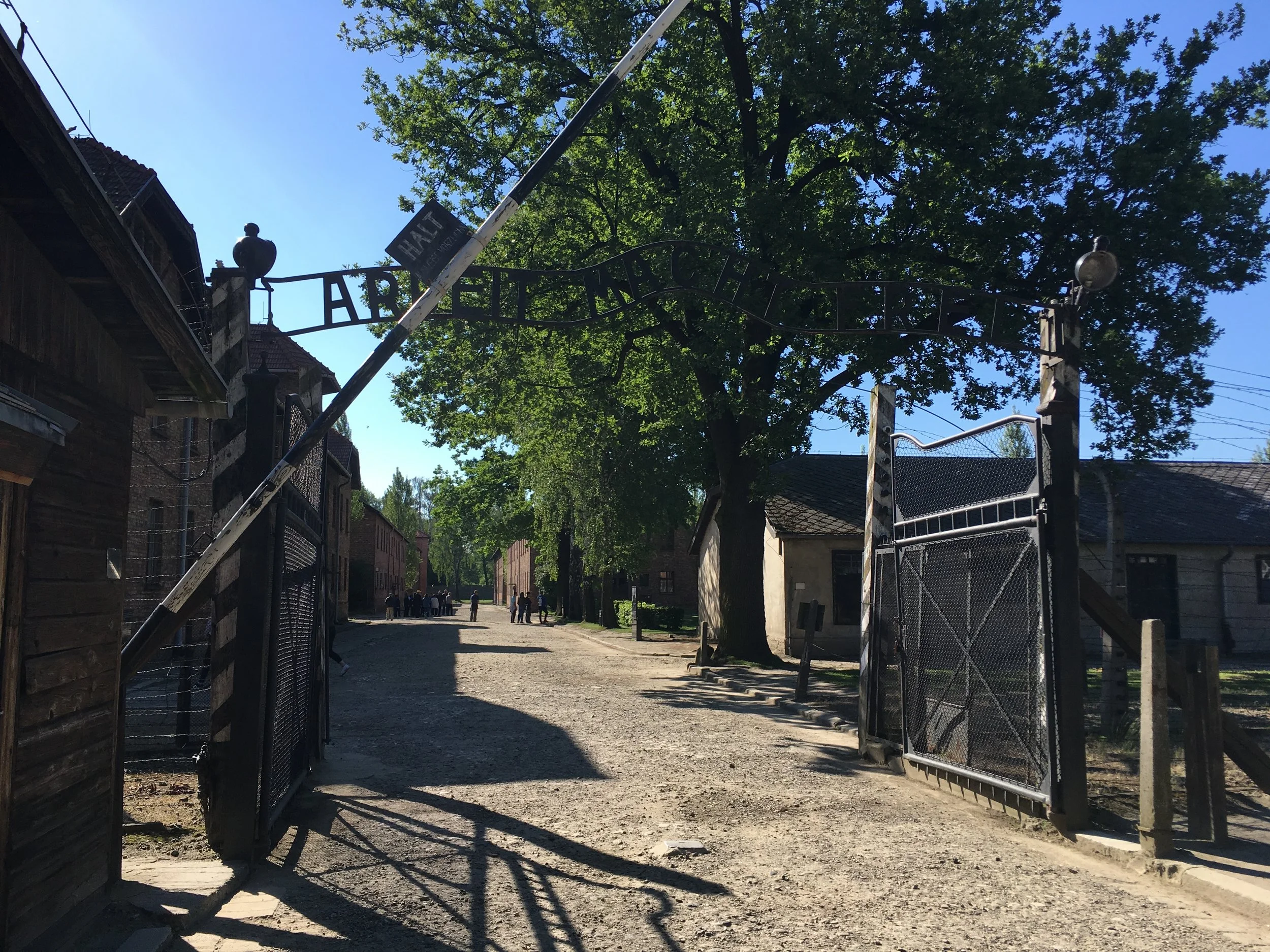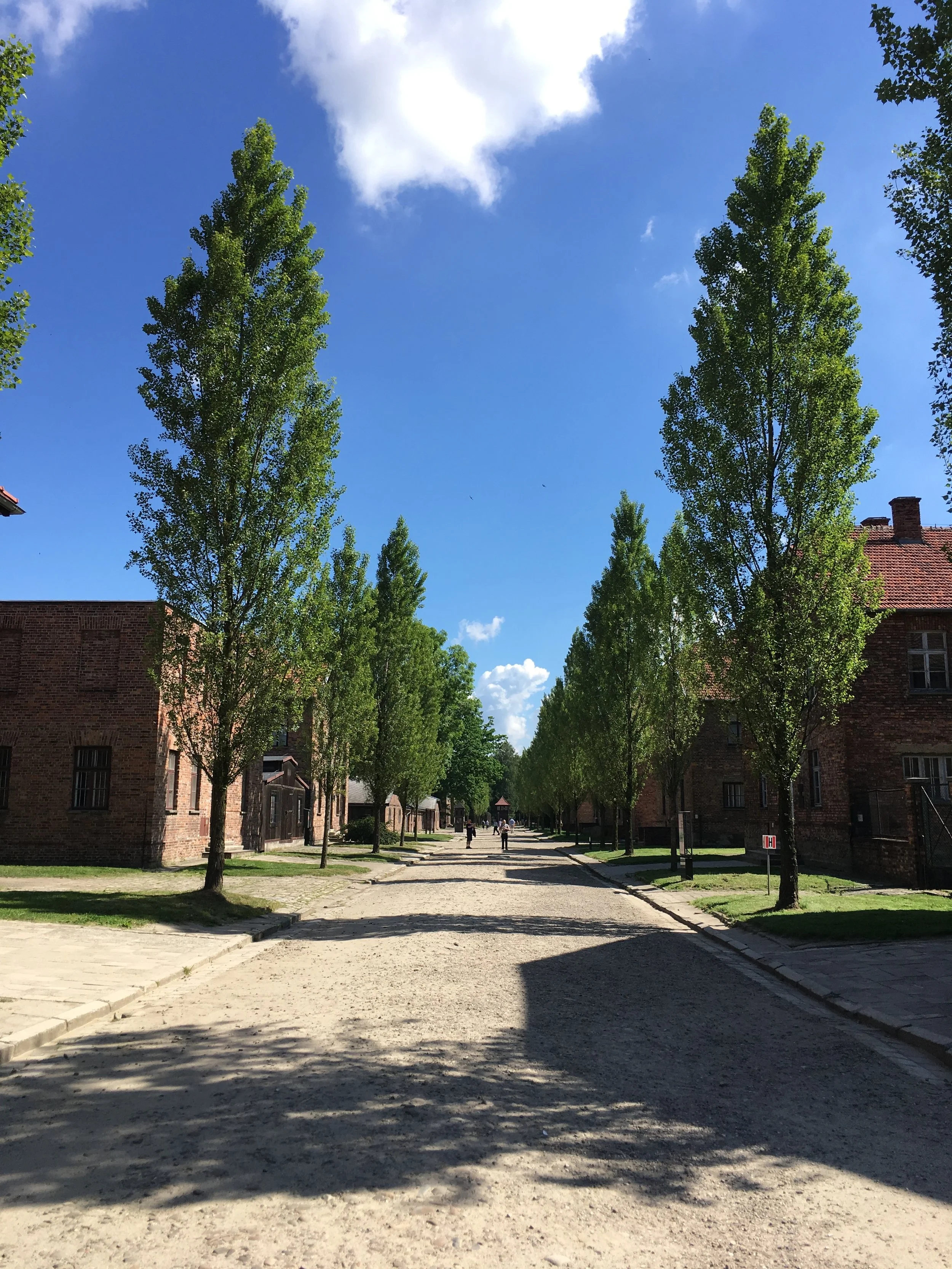 Auschwitz is actually two separate sites, Auschwitz I and II (Birkenau). At Auschwitz I, the sun was glimmering down as I walked under the gate laden with the phrase “Arbeit Macht Frei,” meaning “work sets you free.” The years of quiet after the horrors that took place there has allowed nature to grow, and the trees with such pretty green leaves around the barracks remind me of grass and flowers that curl around a tombstone in a cemetery - covering the tears of loss.