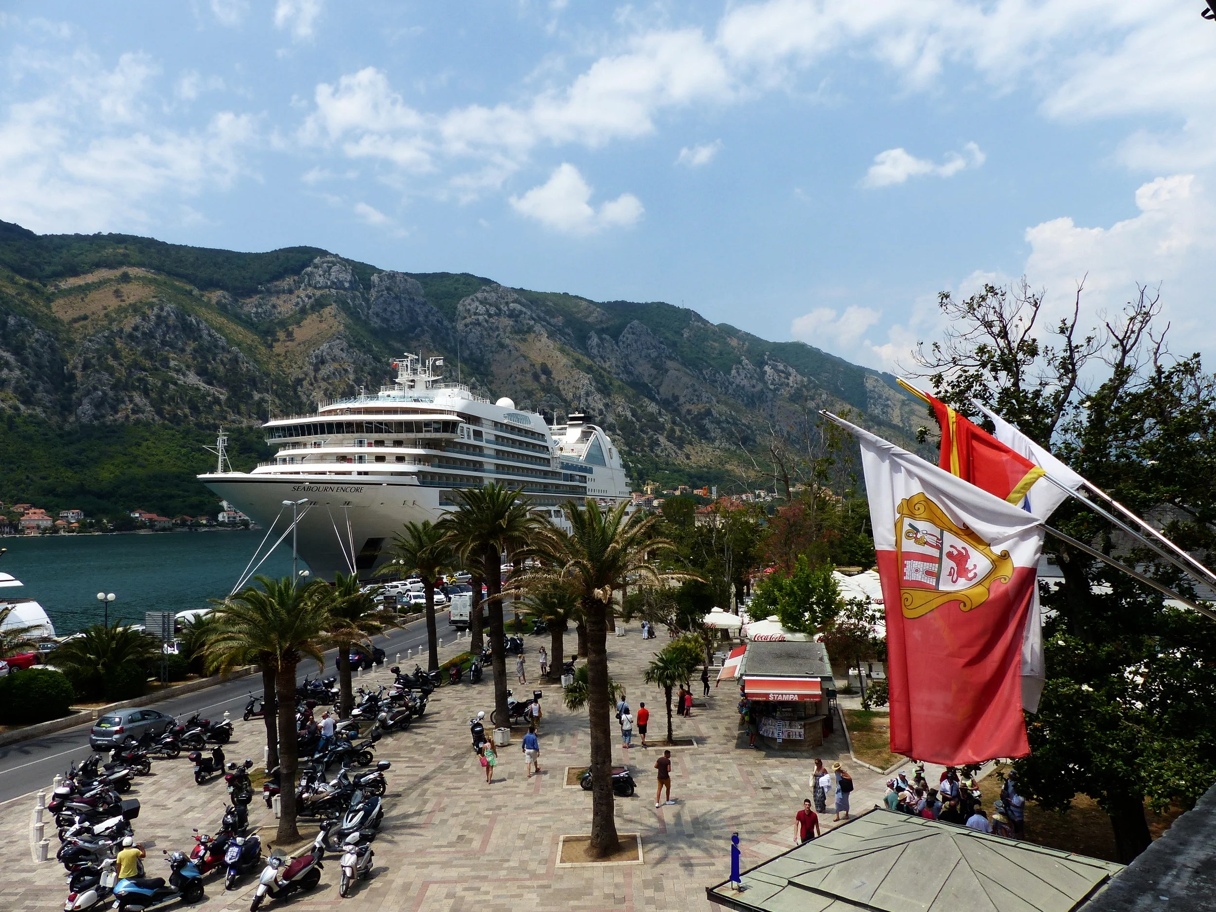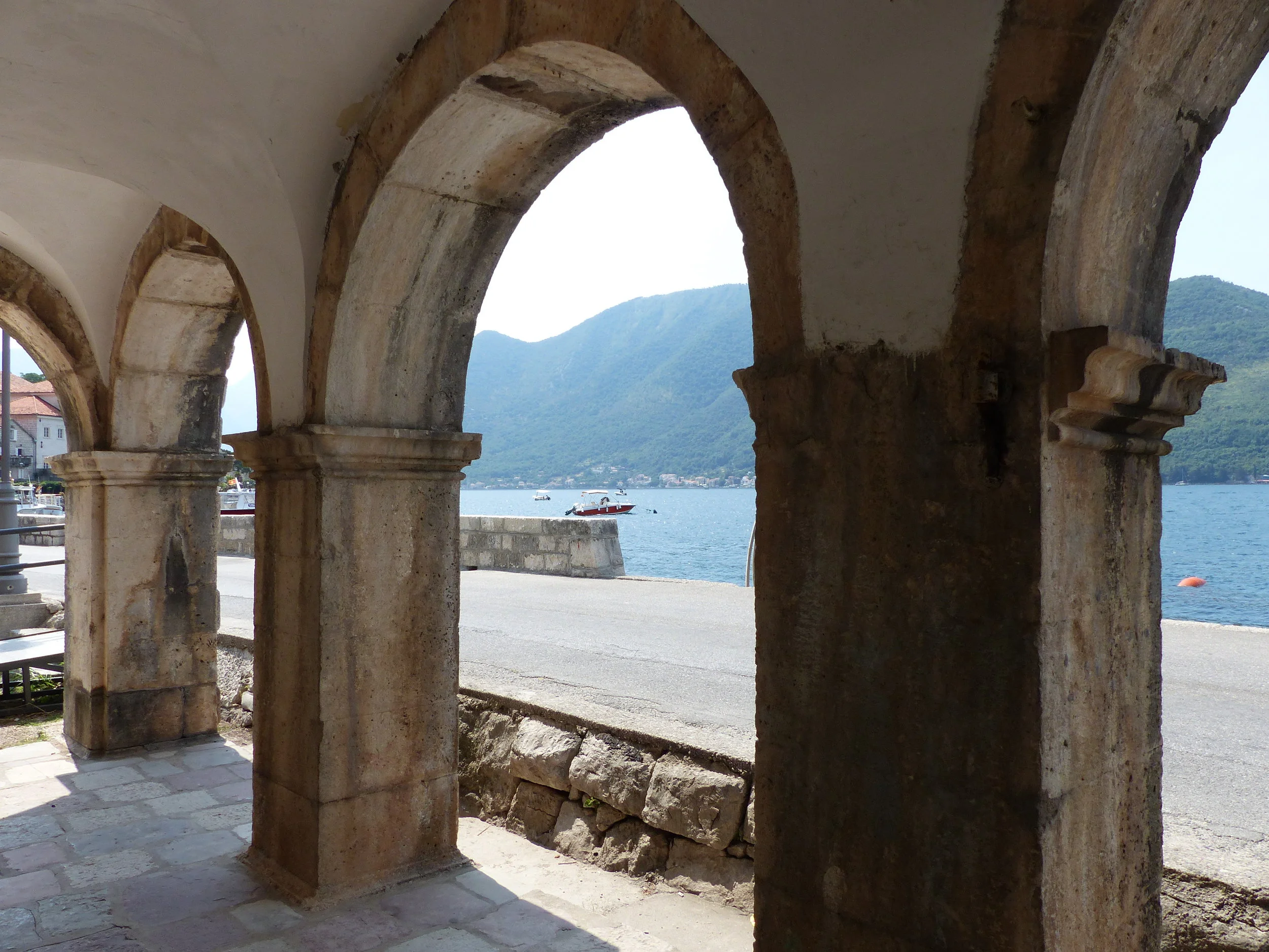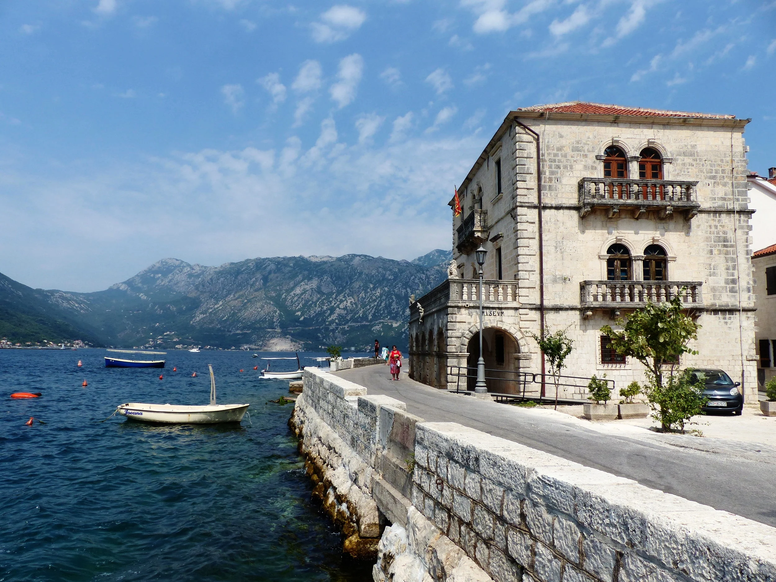 In our small group, we made our first stop at Perast, where some people had also purchased tickets for a boat ride to the island of Our Lady of the Rocks. We only had 45 minutes in total for this stop, so I looked at the crammed boat and opted to skip the boat ride and just walk around the city, which sits beside a beautiful bay. Our Lady of the Rocks is a manmade island anyway, and I could see it well enough from the shore, so I thought, “Eh.”